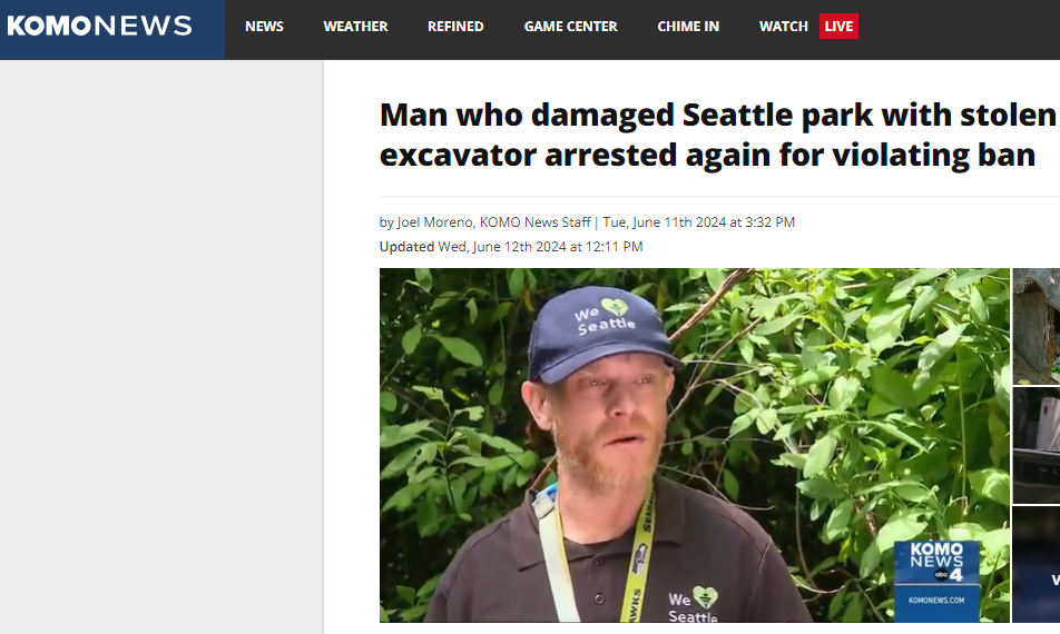 Man who claims he wants to build a cabin, mine for gold at Seattle park arrested again (komonews.com) by Jeremy Harris