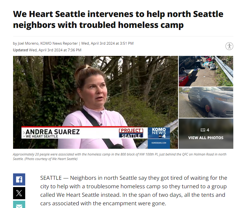 We Heart Seattle intervenes to help North Seattle neighbors with troubled homeless camp (komonews.com) by Joel Moreno